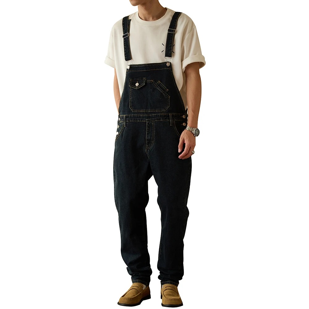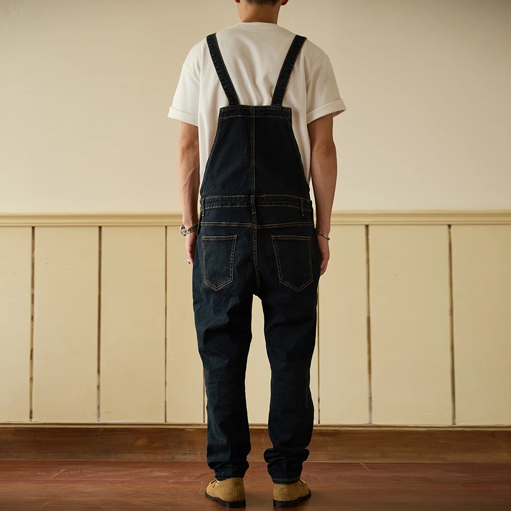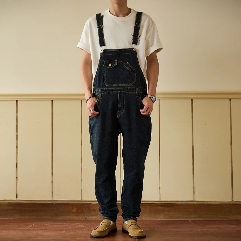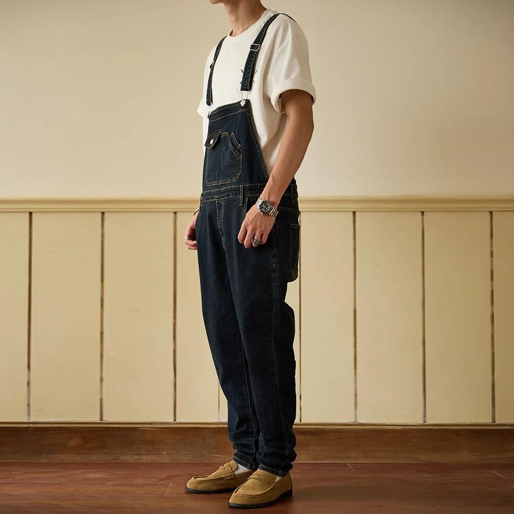 Une salopette masculine type jeans casual et streetwear